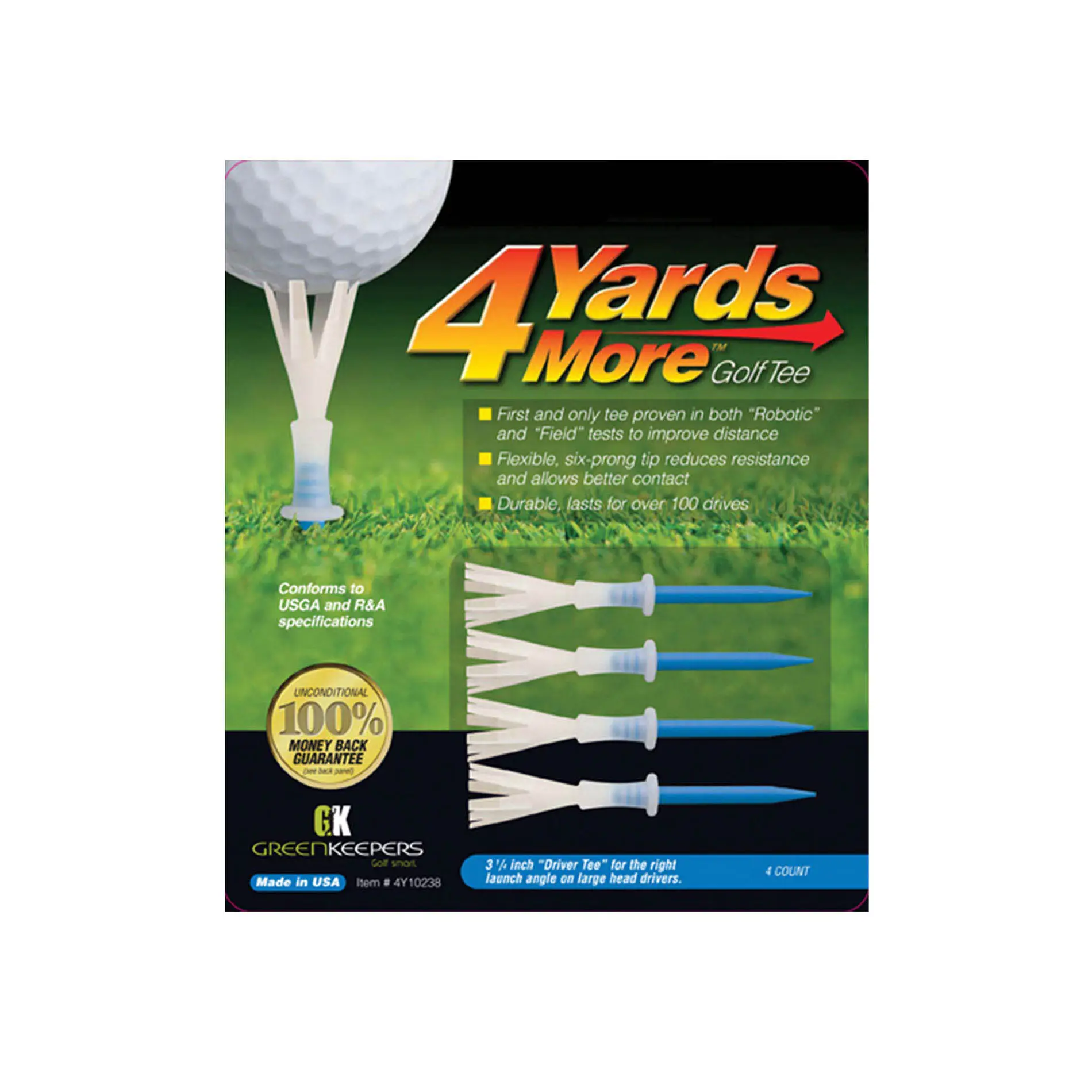 4 Yards More Golf Tees is the only tee scientifically proven in robotic and field tests to out distance the wood tee. Flexible, six-prong tip reduces resistance and allows for better contact. 4 Yards More is committed to the evolution of performance tees.